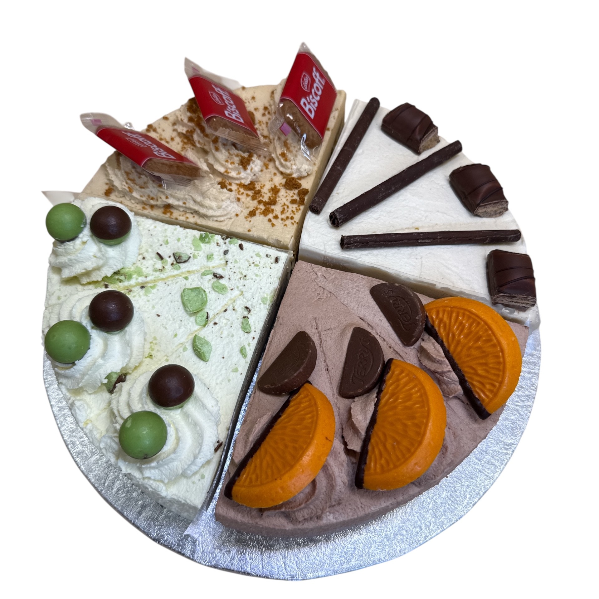 The essential dessert for those who can’t decide which one to have! This gateaux comprises of 4 different quarters: – A section containing 3 slices of white chocolate mint mousse with chocolate sponge, another containing 3 slices of chocolate orange mousse with chocolate sponge and orange layer, a further quarter which has 3 slices of biscoff mousse, vanilla sponge and biscoff topping and finally a section containing 3 slices of hazelnut mousse with chocolate sponge, all topped with flavoured decoration.