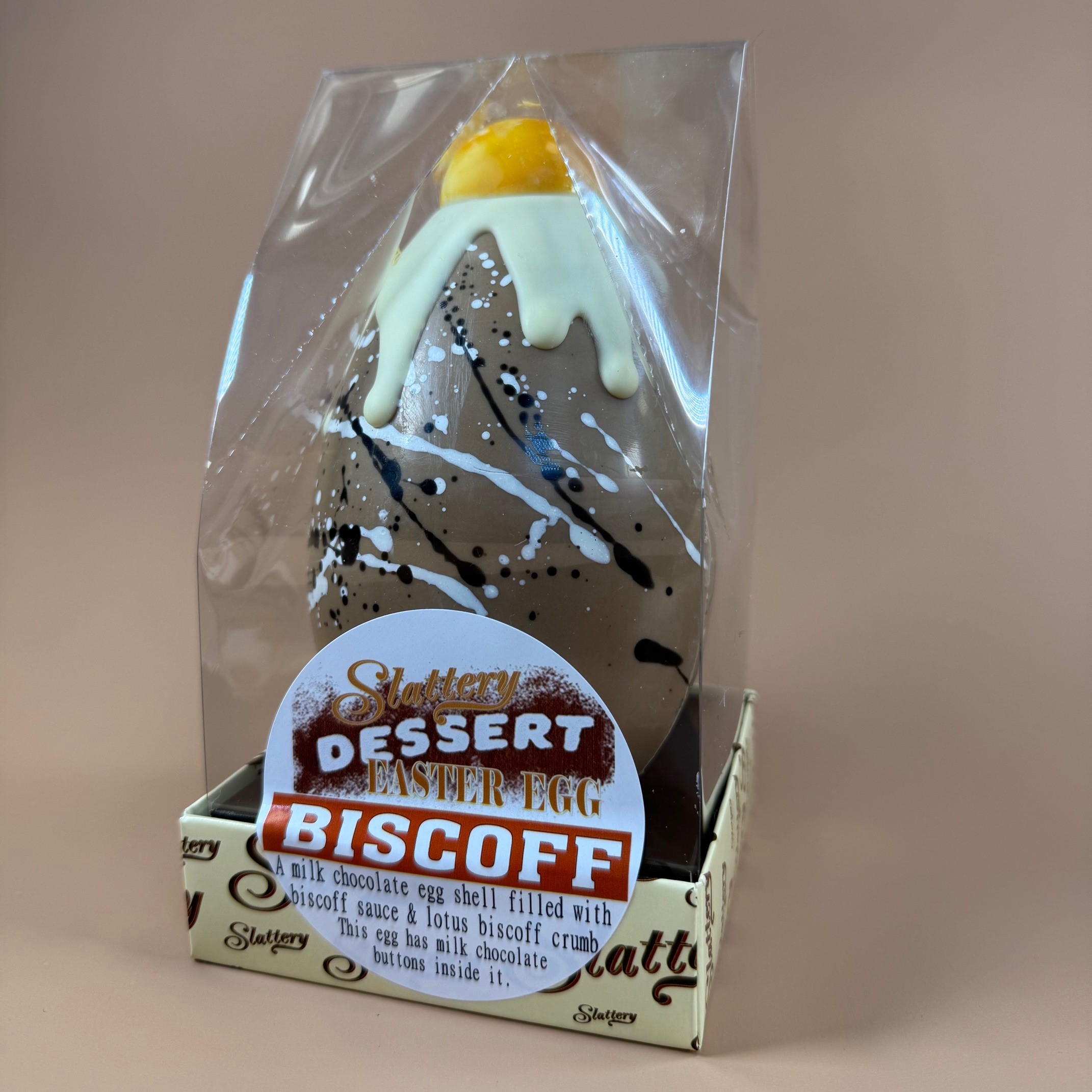 A milk chocolate egg shell filled with Biscoff sauce & lotus Biscoff crumb. This egg has milk chocolate buttons inside it.
