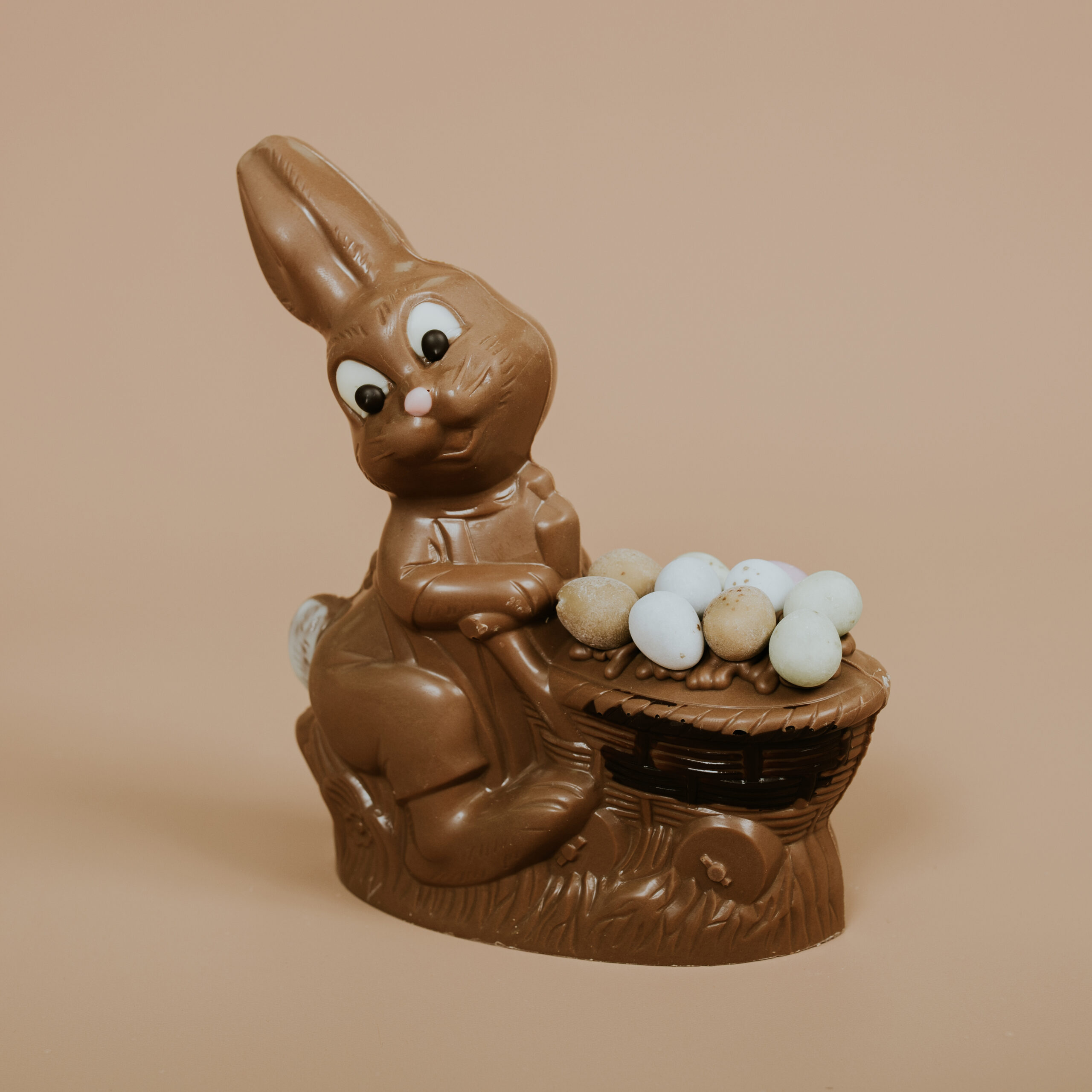 Small milk chocolate rabbit with coloured details and mini eggs in wheelbarrow design. Approx 20cm x 15cm x 7cm and 260g