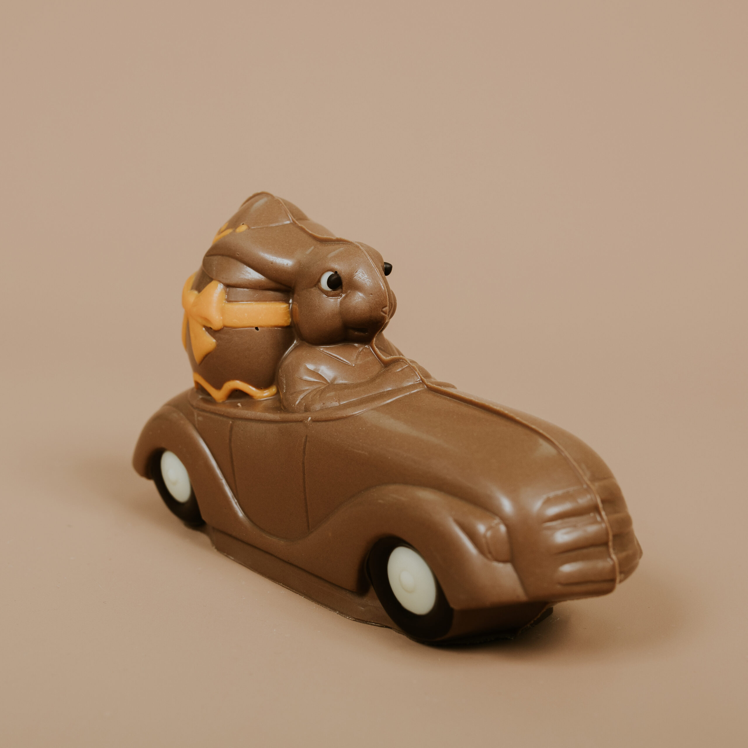 Small milk chocolate rabbit in a car with coloured details. Approx 10cm x 16cm x 5cm and 180g