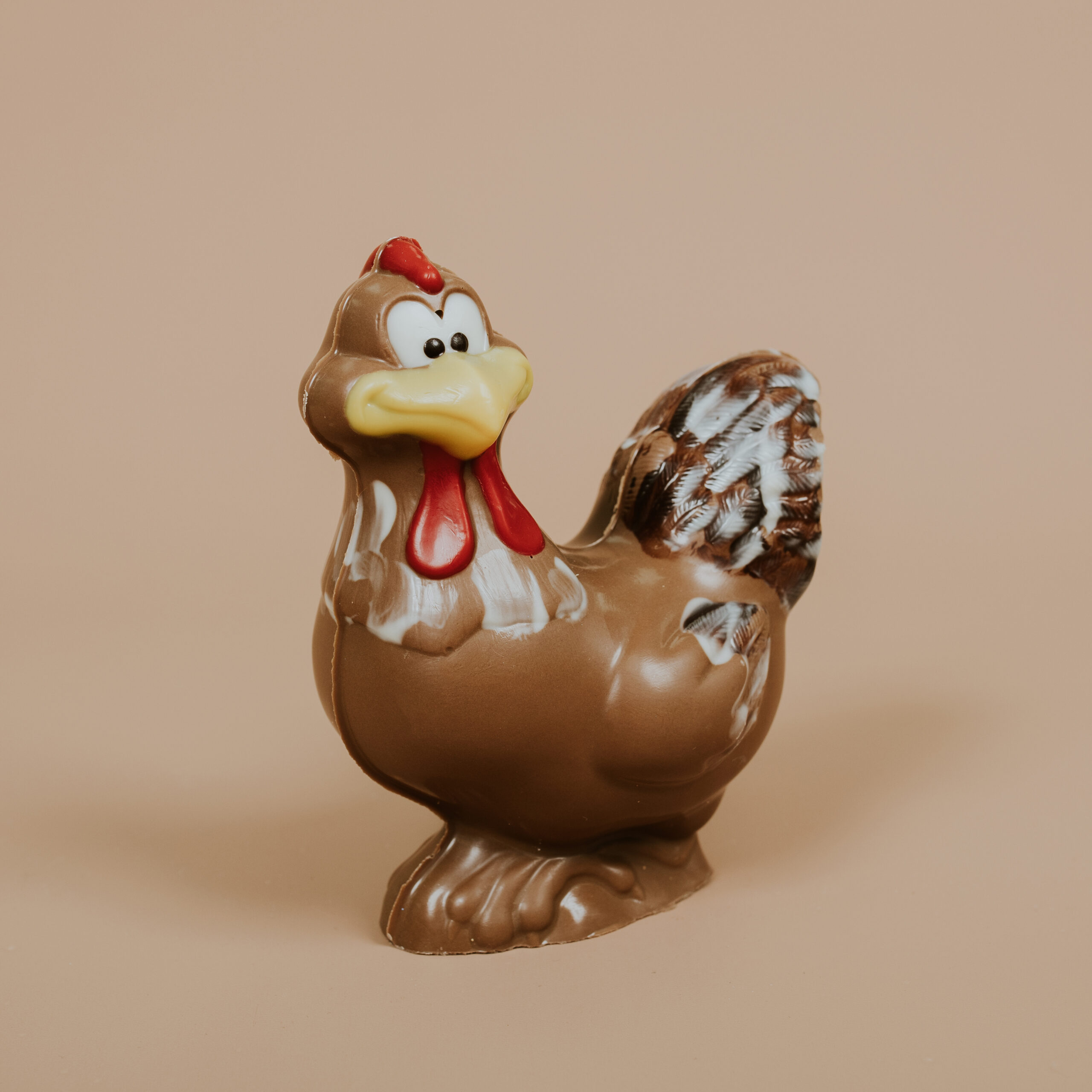 Small milk chocolate hen with coloured details. Approx 17cm x 13cm x 5cm and 200g