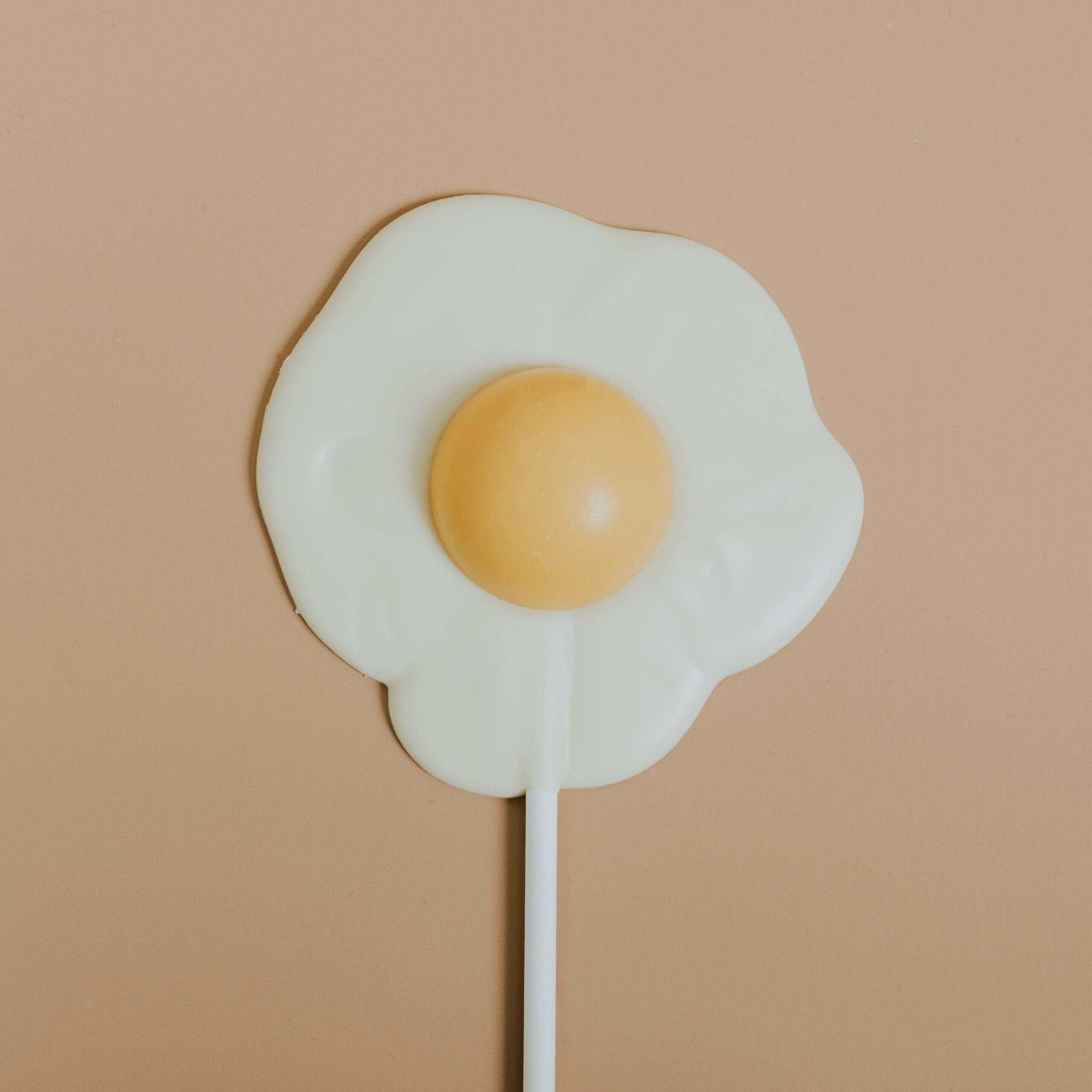 A large milk chocolate lolly with a white and coloured choc egg design.