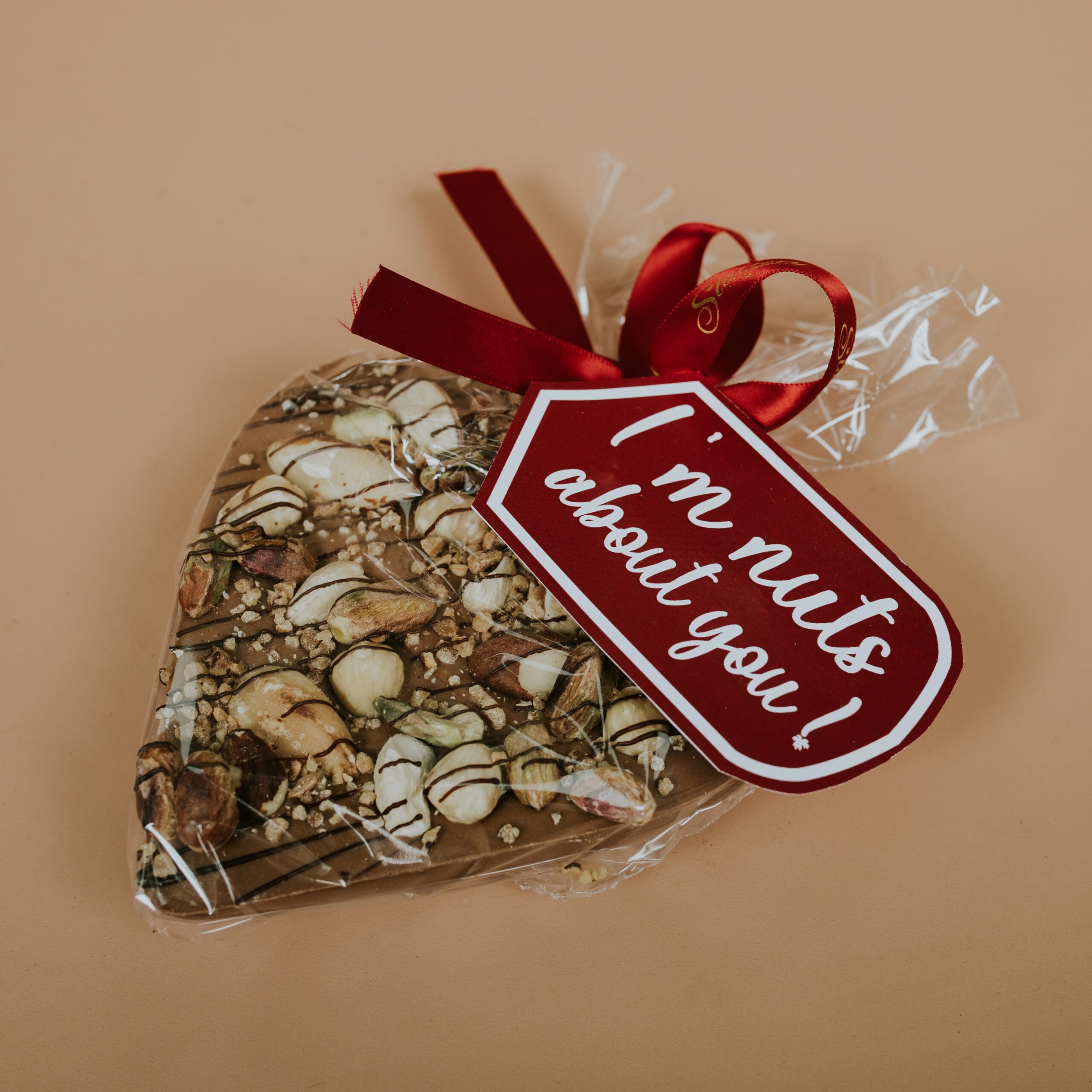 A chunky milk chocolate heart topped with Brazil nuts, hazelnuts, peanuts, almonds, with “I’m nuts about you!” gift tag