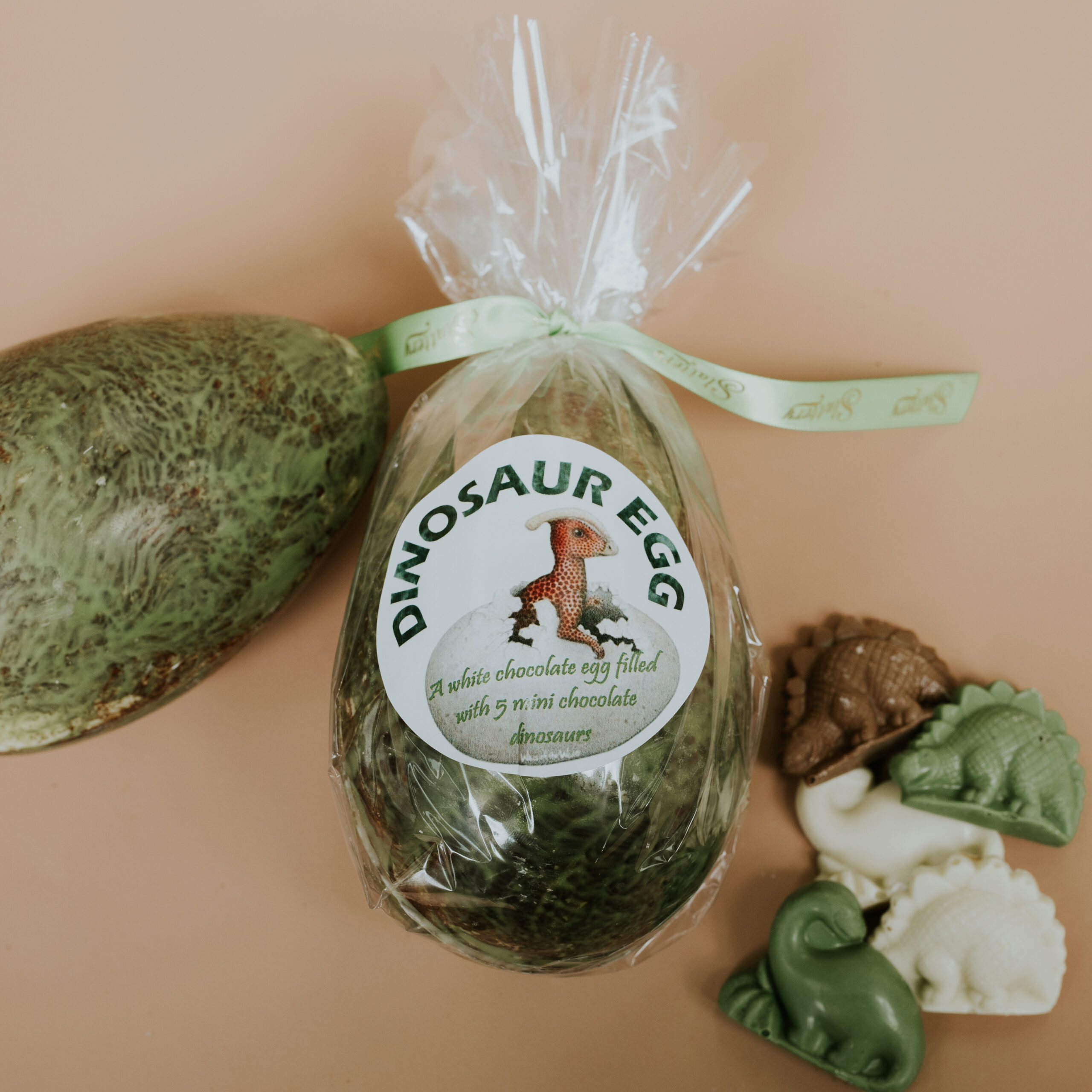 A milk chocolate dinosaur easter egg with green chocolate mottle decoration