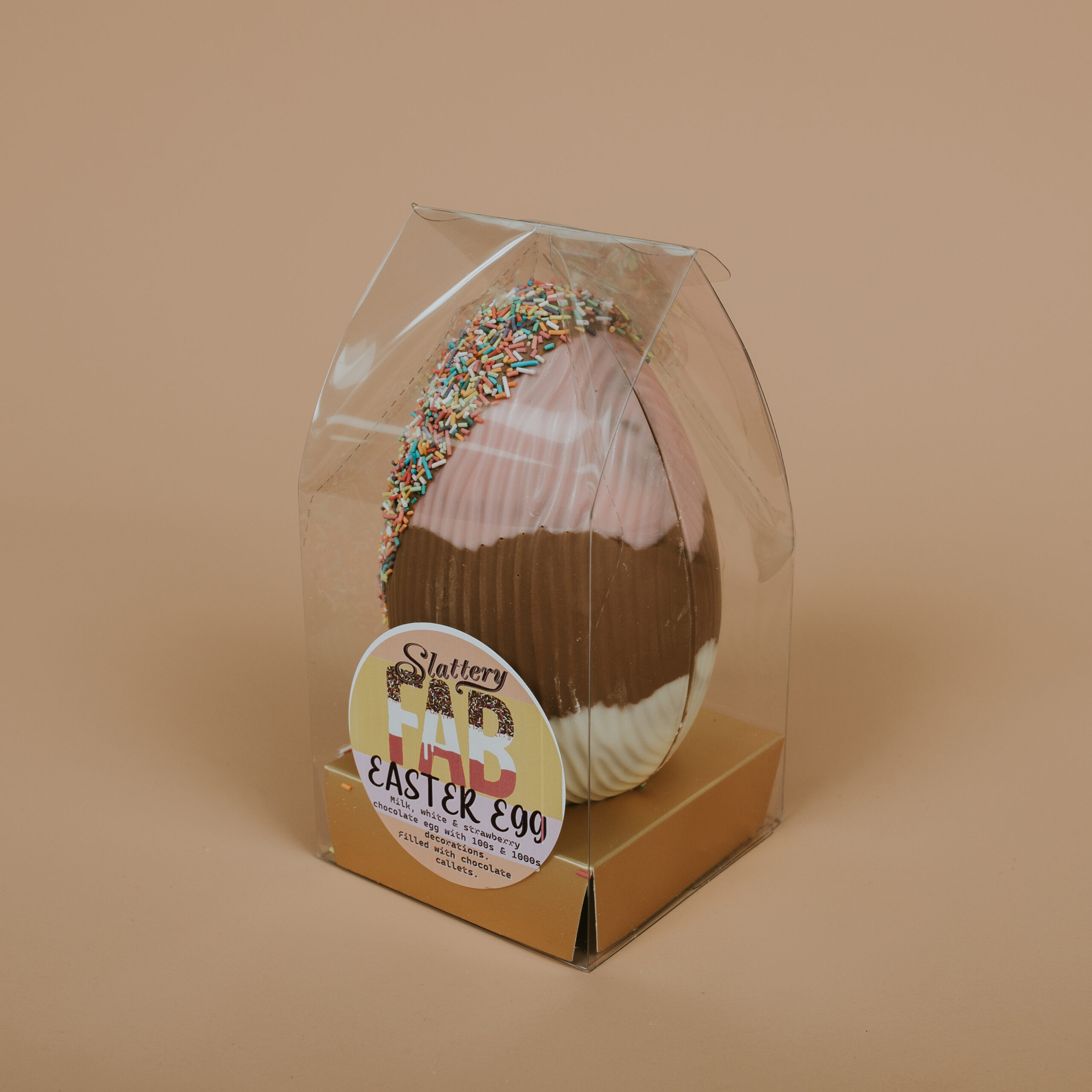 A milk, white and strawberry chocolate easter egg coated in 100s & 1000s sprinkles.